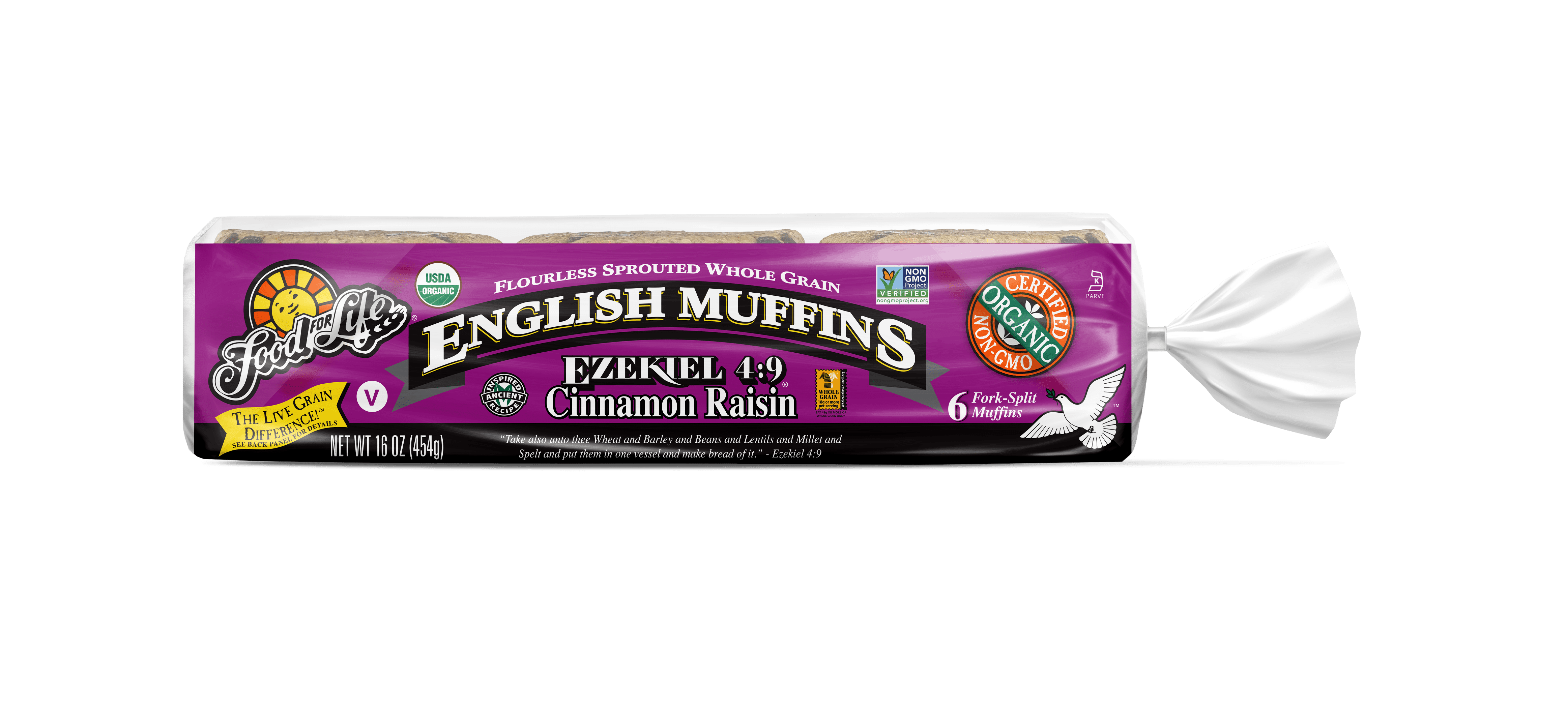 CINNAMON RAISIN FLOURLESS SPROUTED WHOLE GRAIN ENGLISH MUFFINS, CINNAMON RAISIN