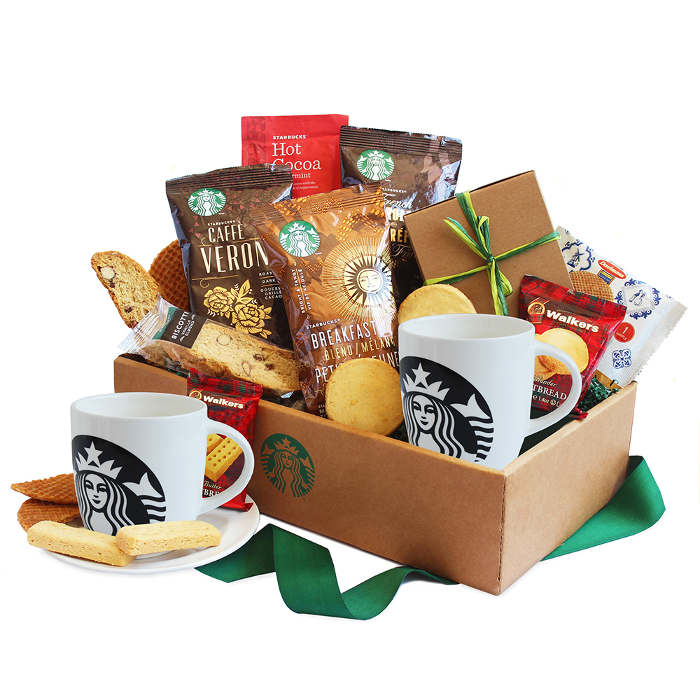 Starbucks House Blend Coffee, Starbucks Breakfast Blend Coffee, Starbucks Sumatra Coffee, Walkers Shortbread Medallions, Two Ceramic Logo Mugs, Walkers Shortbread Fingers, Biscotti, Caramel Wafer Cookies, Starbucks Hot Cocoa