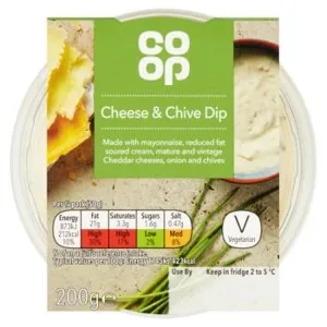 Mayonnaise (Rapeseed Oil, Water, White Wine Vinegar, Pasteurised Egg, Sugar, Salt, Stabilisers (Guar Gum, Xanthan Gum)), Reduced Fat Soured Cream (Milk), Vegetarian Mature Coloured Cheddar Cheese (Milk), Contains Colour (Annatto)), Rapeseed Oil, Vegetarian Vintage Cheddar Cheese (Milk), Onion, Chives, Concentrated Lemon Juice, Cornflour, Sugar, Potassium Sorbate), Potato Starch