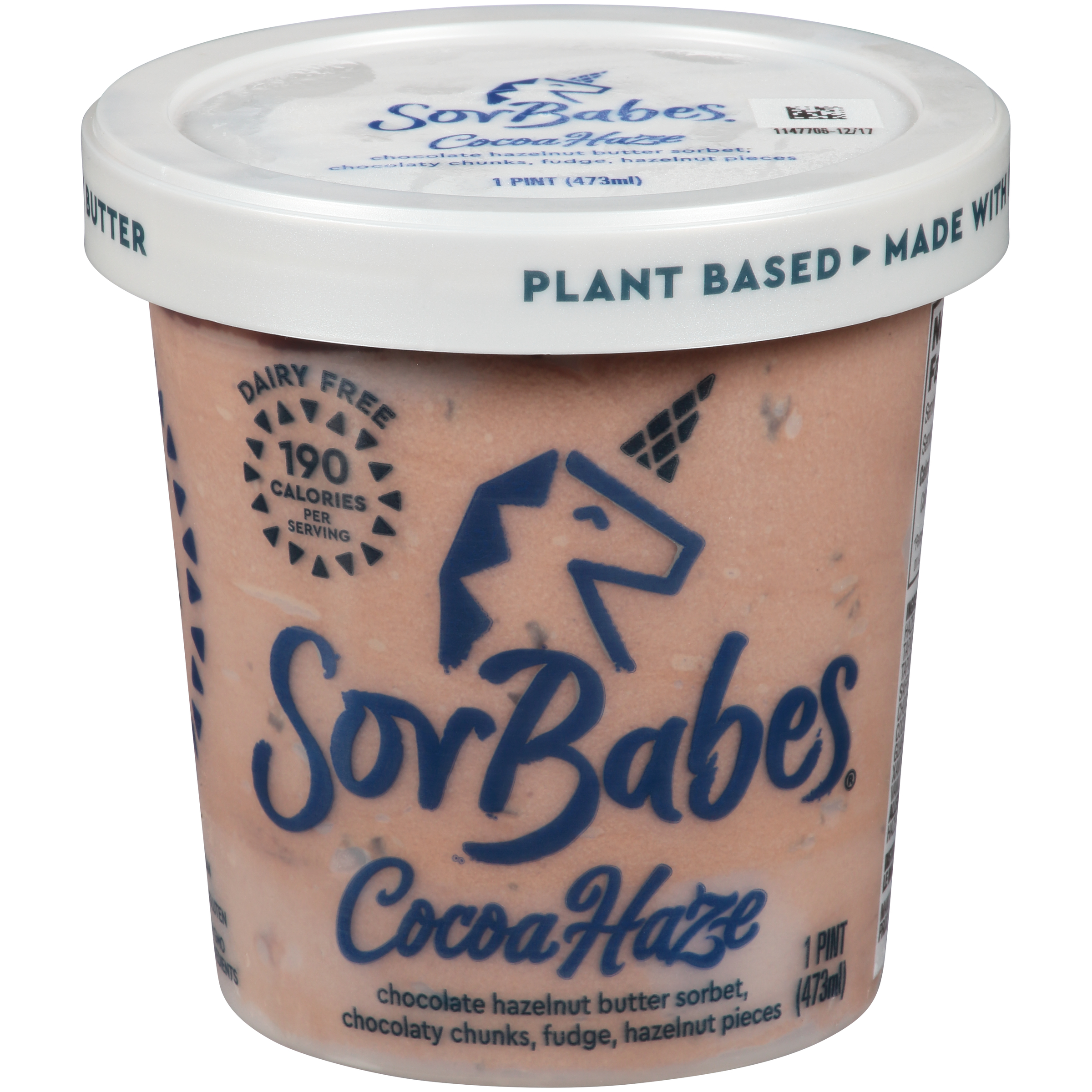 COCOA HAZE CHOCOLATE HAZELNUT BUTTER SORBET, CHOCOLATY CHUNKS, FUDGE, HAZELNUT PIECES, COCOA HAZE