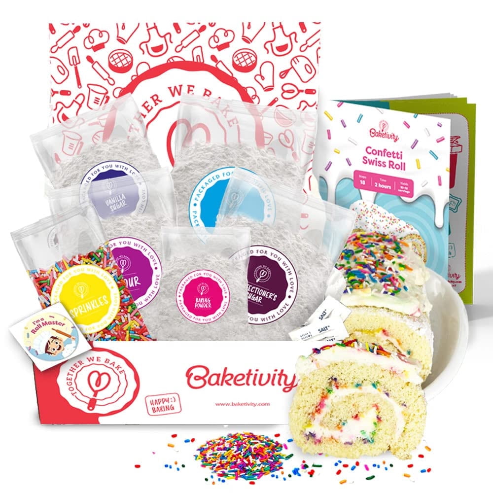 Confetti Swiss Roll Baking Kit For Kids 10 -12, Real Jelly Roll Cake Making Set With Pre-Measured Ingredients, Cake Decorating For Girls And Boys With Cream And Rainbow Sprinkles, Kids Baking Gift Set