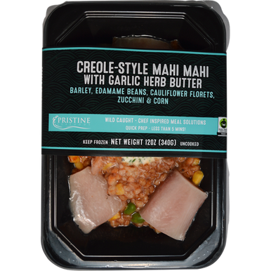 CREOLE-STYLE MAHI MAHI WITH GARLIC HERB BUTTER BARLEY, EDAMAME BEANS, CAULIFLOWER FLORETS, ZUCCHINI & CORN, CREOLE-STYLE WITH GARLIC HERB BUTTER