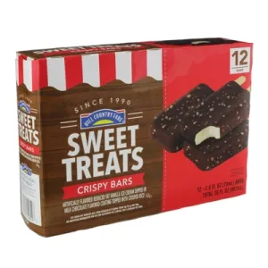 CRISPY SWEET TREATS REDUCED FAT VANILLA ICE CREAM DIPPED IN MILK CHOCOLATE FLAVORED COATING TOPPED WITH CRISPED RICE BARS, CRISPY