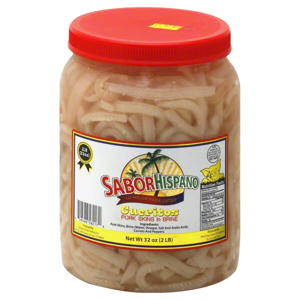 PORK SKINS, BRINE (WATER, VINEGAR, SALT), CARROTS, GREEN CHILES, SPICES.