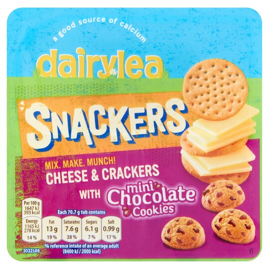 Cheese, Skimmed Milk (Water, Skimmed Milk Powder), Emulsifying Salts (Sodium Citrate, Potassium Citrate), Milk Protein, Butter, Skimmed Milk Powder, Whey Powder (From Milk), Vitamin D, Sorbic Acid), Acidity Regulator (Citric Acid), Anti-caking Agent (Sunflower Lecithin), Wheat Crackers: Wheat Flour, Palm Oil, Wheat Bran, Sugar, Glucose-fructose Syrup, Raising Agents (Ammonium Carbonate, Sodium Carbonate), Wheat Germ, Salt, Flavourings (Contains Milk), Flour Treatment Agent (Sodium Metabisulphite), Chocolate Chips, Cookies: Wheat Flour, Vegetable Fat Blend (Palm And Shea In Varying Proportions), Cocoa Paste, Raising Agents (Sodium Hydrogen Carbonate, Ammonium Hydrogen Carbonate), Dextrose, Cocoa Butter, Emulsifiers (Soya Lecithin, Sunflower Lecithin), Flavouring