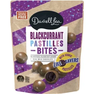 Blackcurrant Centre (55%) [Glucose Syrup, Sugar, Water, Wheat Starch, Acidity Regulators (330, 336), Humectant (422), Natural Flavour, Natural Colour (153)], Milk Chocolate (45%) [Sugar, Milk Solids, Cocoa Butter, Cocoa Mass, Emulsifiers (322 (Soy), 476), Natural Flavour], Glazing Agents (414, 904), Milk Chocolate contains minimum 31% Cocoa Solids and minimum 24% Milk Solids