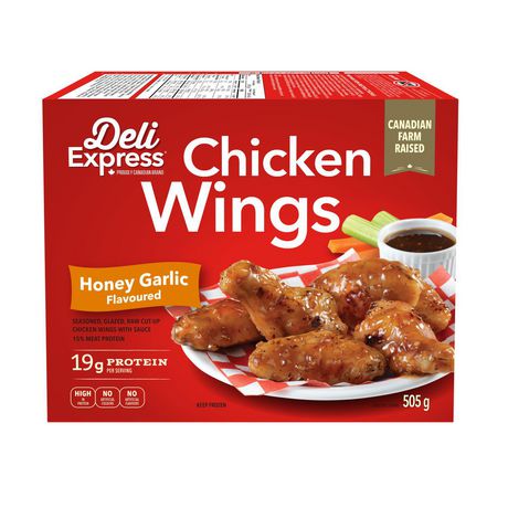 CHICKEN WINGS (DRUMETTES AND WINGLETS). GLAZED WITH: WATER, SUGAR, SOY PROTEIN PRODUCT, SALT, SODIUM PHOSPHATE, FANCY MOLASSES, DRIED GARLIC, MALTODEXTRIN, FLAVOUR, HONEY, YEAST EXTRACT, DRIED TOMATO, DRIED ONIONS, GINGER.