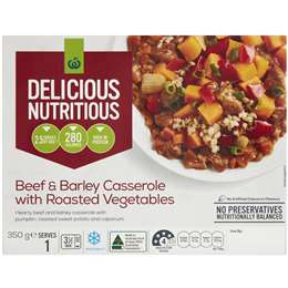 Beef Casserole (51%) (Beef (28%), Onion (22%), Water, Carrot (12%), Celery (4%), Soy Sauce (Soybeans, Wheat), Corn Starch, Tomato Paste (2%), Dijon Mustard, Canola Oil, Yeast Extract, Chicken Flavoured Stock Powder (Soybeans, Wheat), Thyme, Pepper), Roasted Vegetables (30%) (Onion (37%), Sweet Potato (32%), Red Capsicum (28%), Canola Oil, Apple Cider Vinegar), Pumpkin (10%), Cooked Pearl Barley (9%)