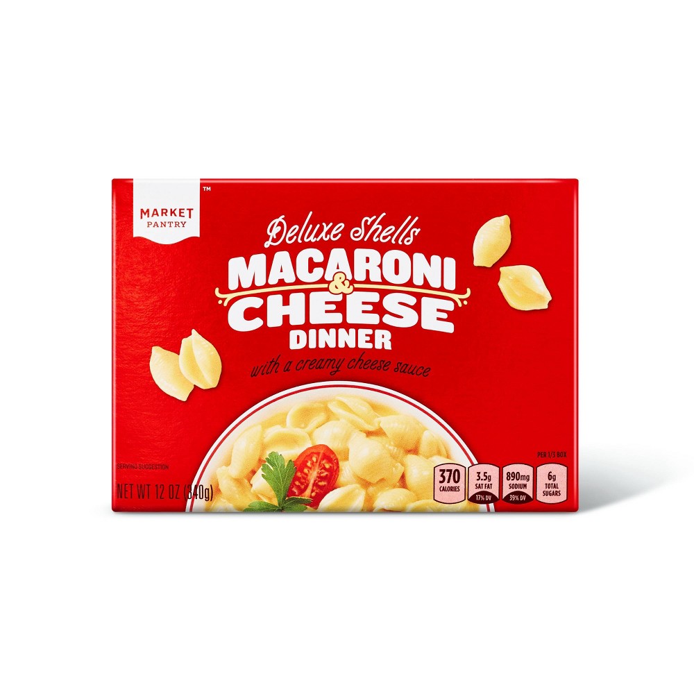 DELUXE SHELLS MACARONI CHEESE DINNER WITH A CREAMY CHEESE SAUCE, DELUXE SHELLS WITH A CREAMY CHEESE SAUCE