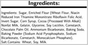 INGREDIENTS: WHEAT FLOUR, CORN SYRUP, INVERT SUGAR, SUGAR, HYDROGENATED VEGETABLE OIL (COCONUT AND/OR PALM KERNEL AND/OR PALM), COCOA POWDER (PROCESSED WITH ALKALI), GLYCERINE, LEAVENING (AMMONIUM BICARBONATE, BAKING SODA, BAKING POWDER [BAKING SODA, CORNSTARCH, SODIUM ALUMINUM SULFATE, CALCIUM SULFATE, MONOCALCIUM PHOSPHATE]), SOY LECITHIN, GELATIN, COCOA POWDER, SALT, HYDROLYZED SOY PROTEIN, NATURAL FLAVOR, SODIUM HEXAMETAPHOSPHATE.