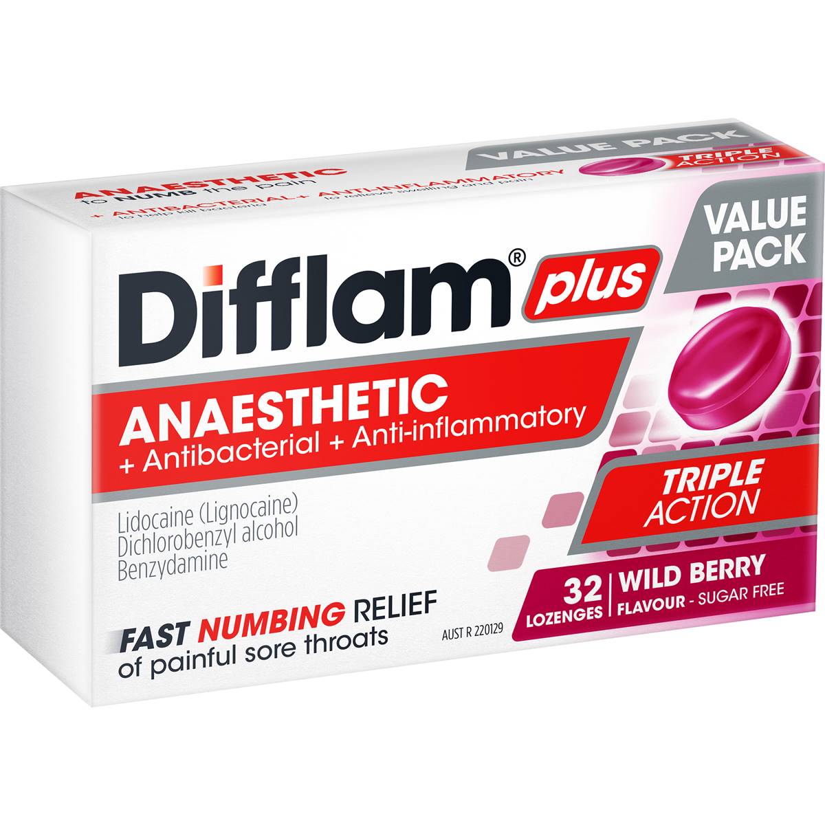 Difflam Plus Triple Action Wild Berry Flavour 32 pack