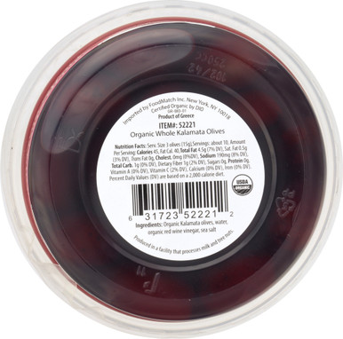 ORGANIC KALAMATA OLIVES, WATER, ORGANIC RED WINE VINEGAR, SEA SALT