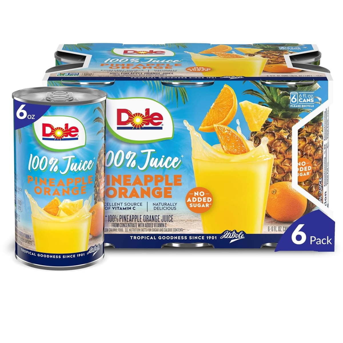 Dole All Natural 100% Pineapple Orange Juice, 6 fl oz, 6 Count Cans