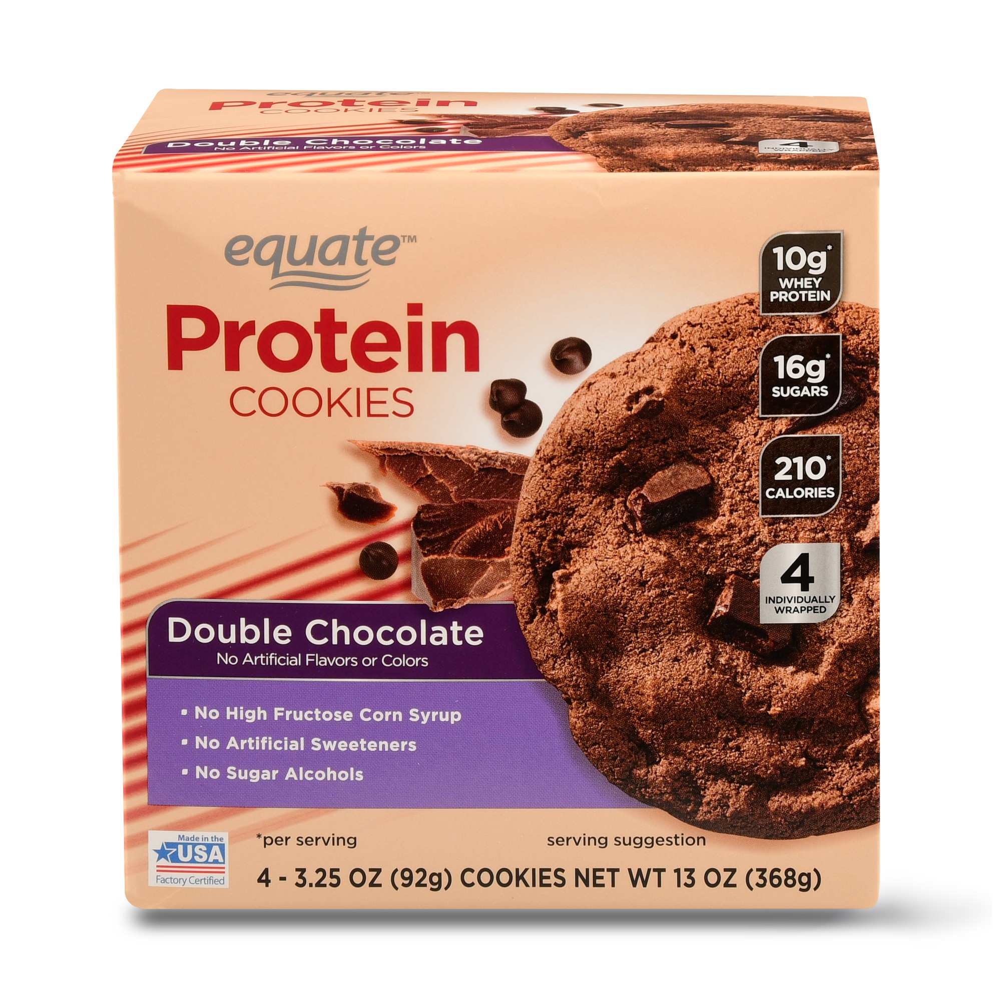WHEY PROTEIN CONCENTRATE (WHEY PROTEIN CONCENTRATE, SOY LECITHIN), BROWN SUGAR (SUGAR, CANE MOLASSES), VEGETABLE SHORTENING (PALM OIL AND SOYBEAN OIL WITH PROPYLENE GLYCOL MONOESTERS, MONO- AND DIGLYCERIDES, SOY LECITHIN), SEMISWEET CHOCOLATE CHUNKS (SUGAR, CHOCOLATE LIQUOR, COCOA BUTTER, DEXTROSE, VANILLA, SOY LECITHIN, SALT), INVERT SUGAR, BLEACHED ENRICHED WHEAT FLOUR (WHEAT FLOUR, NIACIN, REDUCED IRON, THIAMINE MONONITRATE [VITAMIN B1], RIBOFLAVIN [VITAMIN B2], FOLIC ACID), COCOA POWDER (PROCESSED WITH ALKALI), WATER, EGG POWDER (WHOLE EGG, CORN SYRUP, SALT, SOY LECITHIN), CORN SYRUP, DEXTROSE, NONFAT DRY MILK, RAISIN PASTE, NATURAL VANILLA FLAVOR, SODIUM BICARBONATE, SALT, BAKING SODA.
