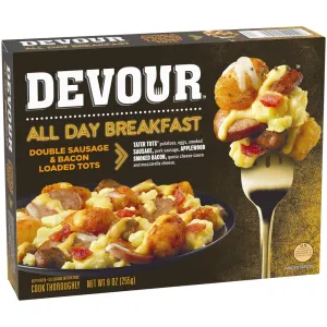 DOUBLE SAUSAGE & BACON LOADED TATER TOTS POTATOES, EGGS, SMOKED SAUSAGE, PORK SAUSAGE, APPLEWOOD SMOKED BACON, QUESO CHEESE SAUCE AND MOZZARELLA CHEESE ALL DAY BREAKFAST, DOUBLE SAUSAGE & BACON LOADED TOTS