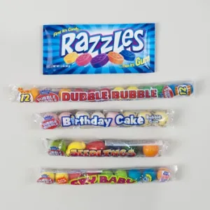 Sugar, Dextrose, Corn Syrup (Glucose), Gum Base, Tapioca Dextrin, Confectioners Glaze, Carnauba Wax, Corn Starch, Artificial Flavors, Artificial Colors (FD&C Red 40, Blue 1, Yellow 5, Yellow 6), BHT (to Maintain Freshness).
