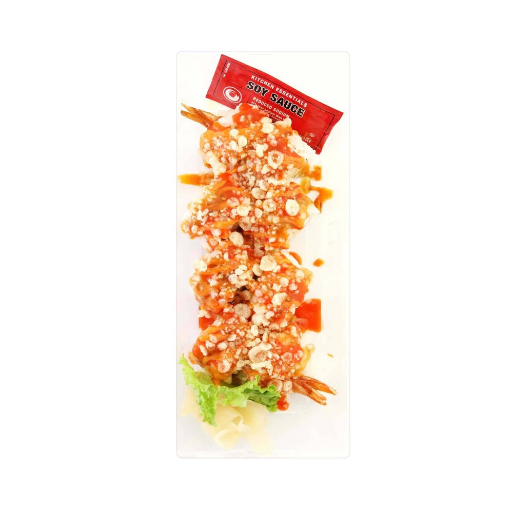 SUSHI RICE (WATER, WHITE RICE, SUSHI VINEGAR (SUGAR, RICE VINEGAR, WATER, SALT, CITRIC ACID, KELP EXTRACT (KELP EXTRACT, SUGAR ALCOHOL, HYDROGENATED STARCH HYDROLYSATES, ALCOHOL, SALT, XANTHAN GUM))), SHRIMP TEMPURA FARM RAISED SHRIMP, WHEAT FLOUR, STARCH, EGG ALBUMEN POWDER, BAKING POWDER, WHOLE EGG POWDER, WHEAT PROTEIN, FOOD COLOR (VITAMIN B2), PRE-FRIED IN NON-GMO PALM OIL), AVOCADO, CREAM CHEESE PASTEURIZED MILK & CREAM, CHEESE CULTURE, SALT, ORGANIC LOCUST BEAN GUM), PICKLED GINGER (GINGER, SALT, SUGAR, VINEGAR), VEGAN SPICY MAYO (VEGAN MAYO (EXPELLER - PRESSED CANOLA OIL, MODIFIED FOOD STARCHES, WHITE DISTILLED VINEGAR, SUGAR, GARLIC PUREE GARLIC, CITRIC ACID), LEMON JUICE CONCENTRATE, PEA PROTEIN, SPICE, TAPIOCA MALTODEXTRIN, FRUIT AND VEGETABLE JUICE (COLOR), RED CHILI PUREE (RED JALAPENO PEPPERS, CITRIC ACID), DEXTROSE, SESAME OIL, SOY SAUCE (SOYBEANS, WHEAT, SALT), CANE SUGAR, DISTILLED VINEGAR, SALT, CAYENNE PEPPER, MODIFIED CORN STARCH, LEMON JUICE CONCENTRATE, RICE VINEGAR, YEAST EXTRACT, CULTURED DEXTROSE, XANTHAN GUM), TERIYAKI SAUCE (SUGAR, SOY SAUCE [SOYBEANS, SALT, SUGAR], MODIFIED FOOD STARCH, PRUNE CONCENTRATE JUICE, SALTED SAKE [SALTED RICE WINE], LEMON CONCENTRATE JUICE, ONION POWDER, NATURAL FLAVOR, XANTHAN GUM, SRIRACHA SAUCE (ORGANIC RED JALAPENO PUREE, ORGANIC SUGAR, ORGANIC GARLIC POWDER, XANTHAN GUM, CITRIC ACID), TEMPURA CRUNCH (CORN STARCH (NON GLUTEN), RICE BRAN OIL, POTATO STARCH, RICE FLOUR, CORN FLOUR, BAKING POWDER [SODIUM BICARBONATE, TAPIOKA SAPP], SALT, XANTHAN GUM), SEAWEED, LETTUCE, SOY SAUCE (PLEASE SEE POUCH)
