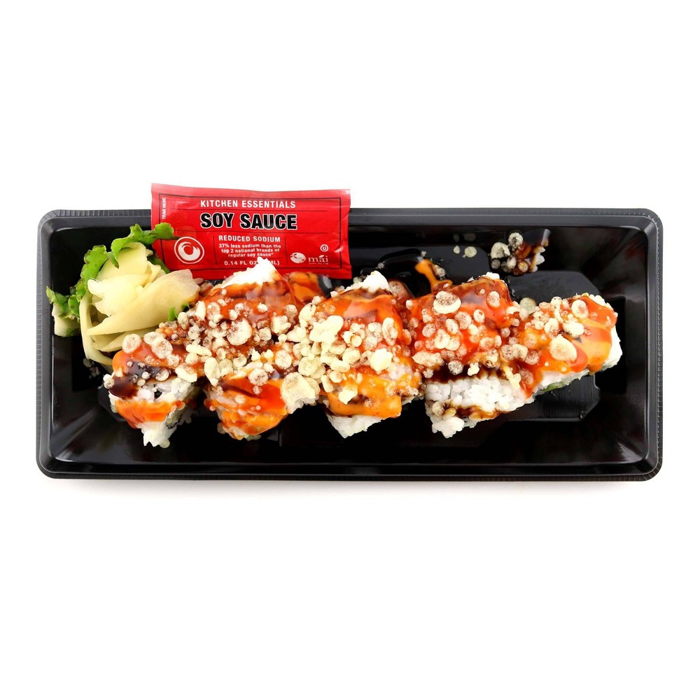 SUSHI RICE (WATER,WHITE RICE,SUSHI VINEGAR (SUGAR, RICE VINEGAR,SALT,CITRIC ACID,KELP EXTRACT (KELP EXTRACT,SORBITOL,MALTITOL,HYDROGENATED STARCH HYDROLYSATE,ALCOHOL, SALT,XANTHAN GUM))), SHRIMP TEMPURA(SHRIMP,WHEAT FLOUR,STARCH,EGG ALBUMEN POWDER,SALT,BAKING POWDER,WHOLE EGG POWDER,WHEAT PROTEIN,FOOD COLOR(VITAMIN B2),PRE - FRIED PALM OIL),AVOCADO,CREAM CHEESE(PASTEURIZED MILK&CREAM,CHEESE CULTURE,SALT,LOCUST BEAN GUM),PICKLED GINGER (GINGER,SALT,SUGAR,VINEGAR), VEGAN SPICY MAYO (CANOLA OIL, BROWN RICE SYRUP, APPLE CIDER VINEGAR,SOY PROTEIN,SEA SALT,MUSTARD FLOUR,LEMON JUICE CONCENTRATE),RED CHILI PUREE (RED JALAPENO,CITRIC ACID),DEXTROSE,SESAME OIL, SOY SAUCE (SOYBEAN,WHEAT,SALT), SUGAR,DISTILLED VINEGAR,SALT,CAYENNE,MODIFIED CORN STARCH,LEMON JUICE CONCENTRATE,RICE VINEGAR,YEAST EXTRACT,CULTURED DEXTROSE XANTHAN GUM),TERIYAKI SAUCE (SUGAR,SOY SAUCE[SOYBEAN,SALT, SUGAR],MODIFIED FOOD STARCH,PRUNE CONCENTRATE JUICE,SALTED RICE WINE,SALT,LEMON CONCENTRATE JUICE,ONION POWDER,NATURAL FLAVOR,XANTHAN GUM),SRIRACHA SAUCE (RED JALAPENO,SUGAR,SALT, GARLIC,DISTILLED VINEGAR,XANTHAN GUM, TABASCO BRAND PEPPER SAUCE (DISTILLED VINEGAR,RED PEPPER, SALT)),TEMPURA CRUNCH (CORN STARCH,RICE BRAN OIL,POTATO STARCH,RICE&CORN FLOUR,BAKING POWDER[SODIUM BICARBONATE,TAPIOKA SAPP],SALT,XANTHAN GUM),SEAWEED,LETTUCE