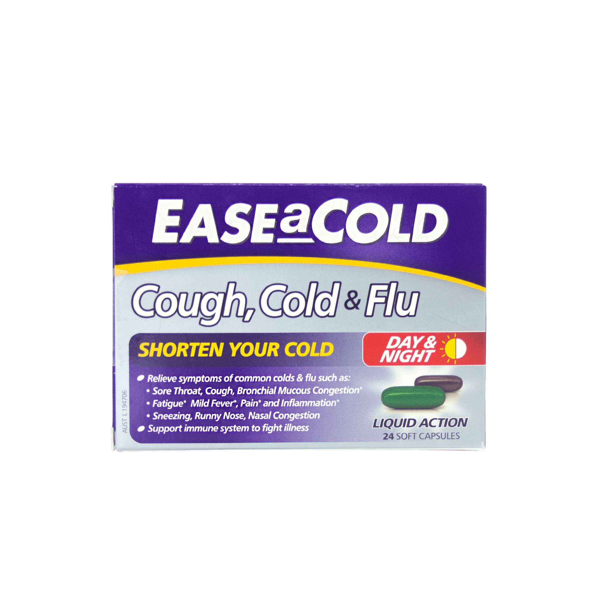 Ease A Cold Cough, Cold & Flu Shorten Your Cold, Day & Night Liquid Action 24 Soft Capsules