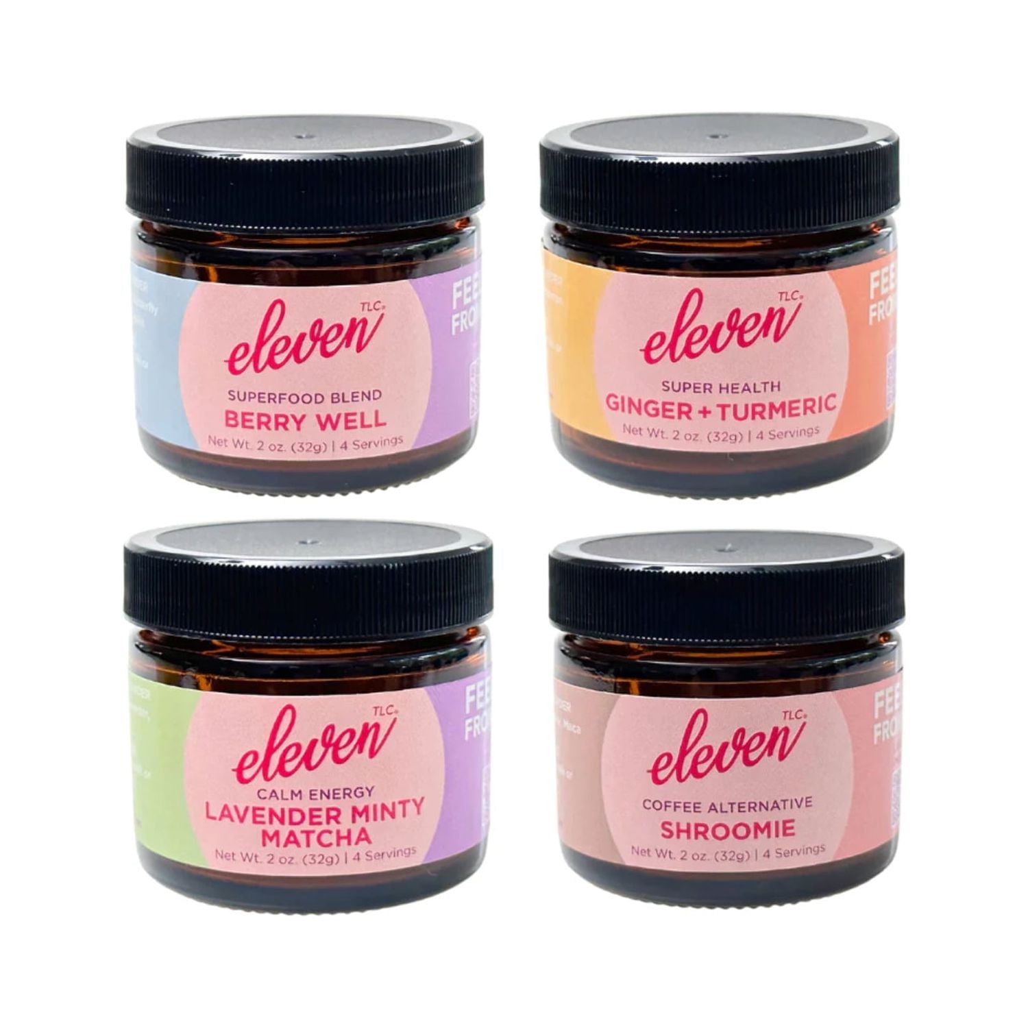 Eleven TLC, Mighty Mini Latte 4 Pack Sampler Pack. Shroomie, Berry Well, Ginger Turmeric and Minty Lavender Matcha