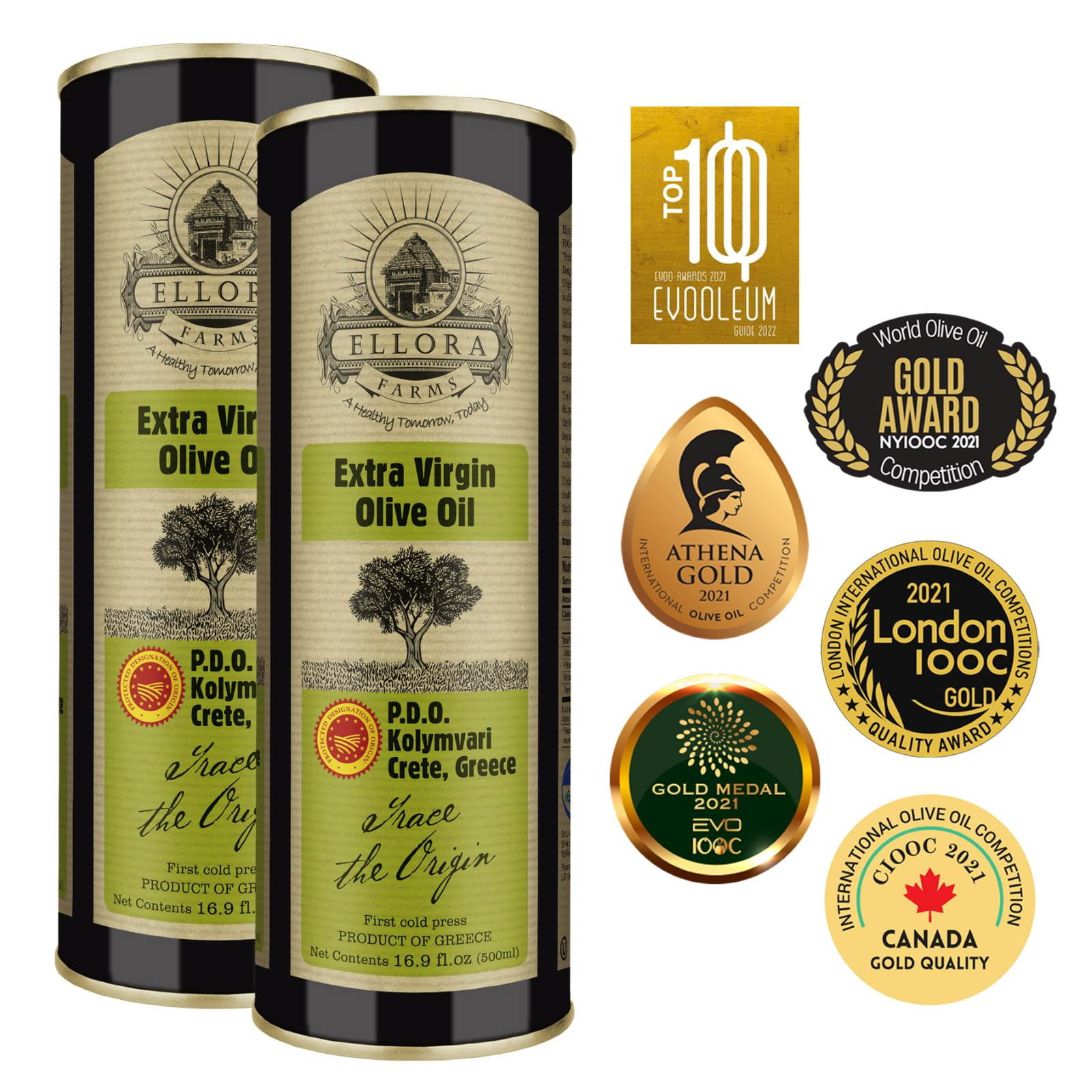 Ellora Farms® Single Origin Single Estate | Traceable & Cold Press | Greek PDO Extra Virgin Olive Oil Round Tins | 16.9 Oz BPA Free Tins | Pack of 2