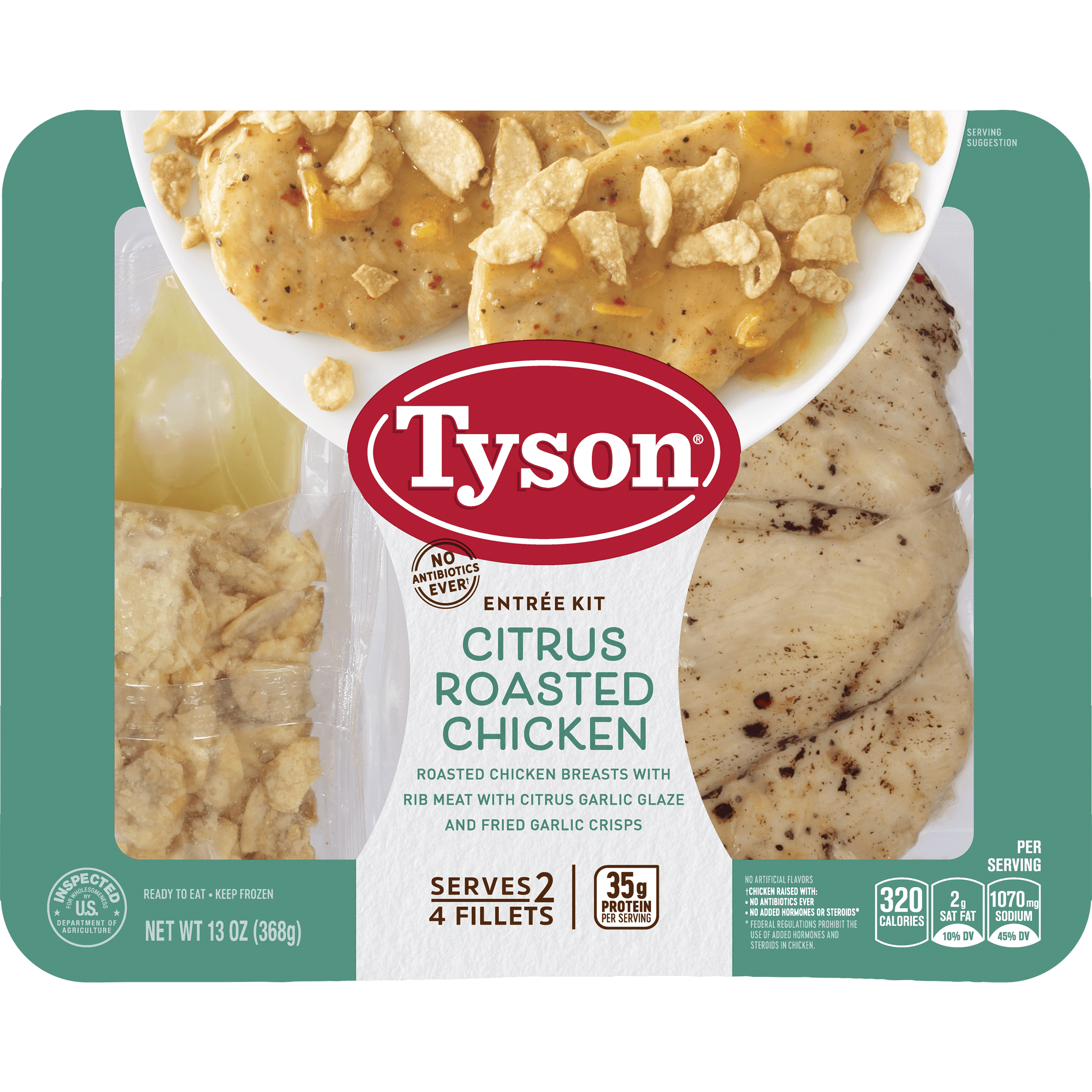 FULLY COOKED SEASONED BONELESS, SKINLESS CHICKEN BREAST WITH RIB MEAT, COATED WITH RED BELL PEPPER AND SPICES: BONELESS, SKINLESS CHICKEN BREAST WITH RIB MEAT, WATER, CONTAINS 2% OR LESS OF THE FOLLOWING: CHICKEN BROTH, CHICKEN FAT, CHICKEN POWDER, DEHYDRATED RED BELL PEPPER, FLAVORS, GARLIC POWDER, MALTODEXTRIN, MODIFIED CORN STARCH, ONION POWDER, POTATO STARCH, SALT, SPICES, SUNFLOWER OIL, YEAST EXTRACT. CITRUS GARLIC GLAZE POUCH: CORN SYRUP, WATER, PINEAPPLE JUICE CONCENTRATE, GARLIC, MODIFIED CORN STARCH, CONTAINS 2% OR LESS OF ORANGE JUICE CONCENTRATE, ORANGE PEEL, LEMON JUICE CONCENTRATE, SOYBEAN OIL, SALT, GELATIN, KEY LIME JUICE CONCENTRATE, YEAST, CITRIC ACID, XANTHAN GUM, YEAST EXTRACT, NATURAL FLAVOR. CRISPY GARLIC POUCH: GARLIC, SUNFLOWER, SAFFLOWER AND/OR CANOLA OIL, ENRICHED FLOUR (WHEAT FLOUR, NIACIN, REDUCED IRON, THIAMIN MONONITRATE, RIBOFLAVIN, FOLIC ACID), SALT.