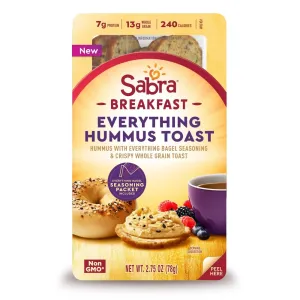 INGREDIENTS: HUMMUS (COOKED CHICKPEAS [WATER, CHICKPEAS], WATER, TAHINI [GROUND SESAME], SOYBEAN OIL, GARLIC, SALT, CITRIC ACID, POTASSIUM SORBATE TO MAINTAIN FRESHNESS), WHOLE GRAIN TOAST (WHOLE WHEAT FLOUR, SOYBEAN OIL, PUMPKIN SEEDS, FLAX SEEDS, ROLLED OATS, HULLED MILLET, LESS THAN 2% OF SUGAR, SALT, YELLOW CORNMEAL, YEAST, MALTED BARLEY FLOUR, OAT FIBER, WHEAT GLUTEN, ONION, GARLIC, NATURAL FLAVOR, ASCORBIC ACID TO MAINTAIN FRESHNESS), EVERYTHING BAGEL SEASONING (SESAME SEEDS, ONION FLAKES, POPPY SEEDS, GRANULATED GARLIC, CITRIC ACID, LEMON OIL, LEMON JUICE).