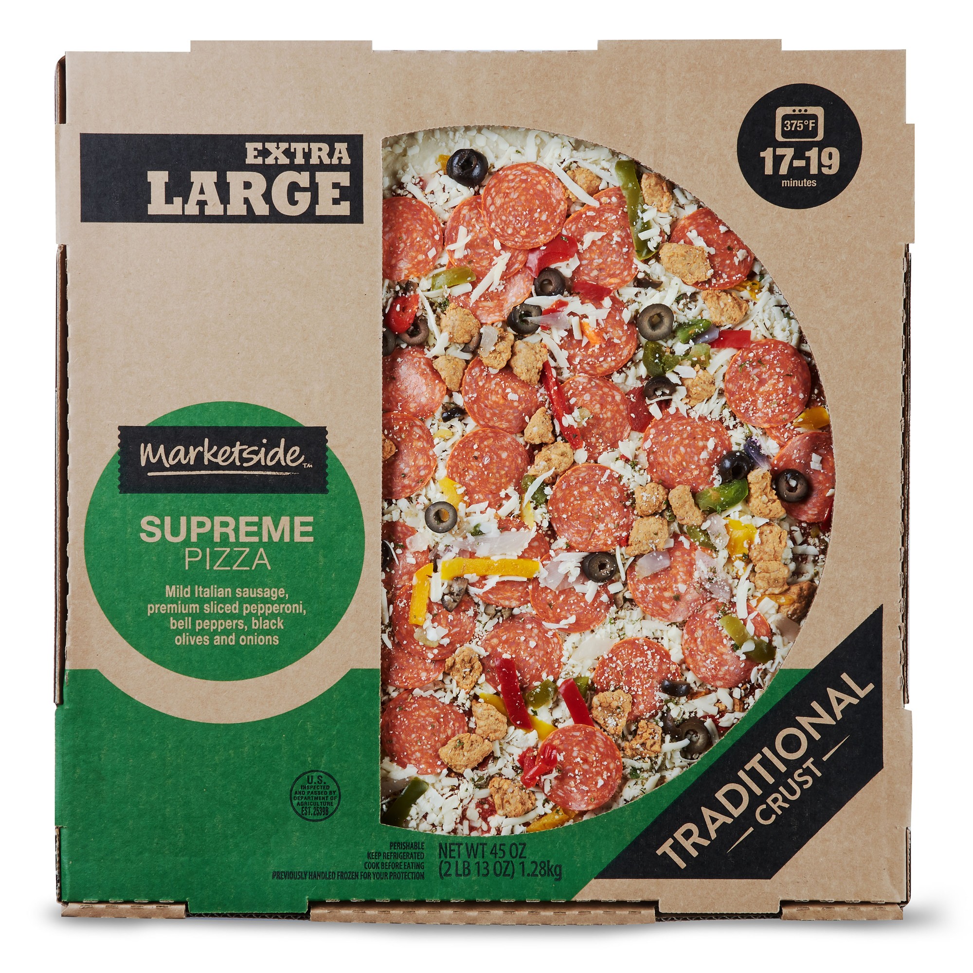CRUST (UNBLEACHED ENRICHED WHEAT FLOUR [WHEAT FLOUR, NIACIN, REDUCED IRON, THIAMINE MONONITRATE, RIBOFLAVIN, FOLIC ACID], WATER, PALM OIL, YEAST, CONTAINS 2% OR LESS OF: SUGAR, SOYBEAN OIL, EXTRA VIRGIN OLIVE OIL, SALT, NATURAL FLAVOR), SAUCE (TOMATO PUREE [WATER, TOMATO PASTE], SUGAR, CONTAINS 2% OR LESS OF: SPICES, SALT, SOYBEAN OIL, CITRIC ACID, XANTHAN GUM, DEHYDRATED ONION, GARLIC POWDER), LOW MOISTURE WHOLE MILK MOZZARELLA CHEESE (PASTEURIZED MILK, CHEESE CULTURES, SALT, ENZYMES), PEPPERONI, BHA, BHT, AND CITRIC ACID ADDED TO HELP PROTECT FLAVOR (PORK, SALT, CONTAINS 2% OR LESS OF: BEEF, DEXTROSE, FLAVORINGS, LACTIC ACID STARTER CULTURE, OLEORESIN OF PAPRIKA, SODIUM NITRITE, SPICES, SODIUM ASCORBATE, BHA, BHT, CITRIC ACID), COOKED ITALIAN SAUSAGE (PORK, SPICES, WATER, SALT, CORN SYRUP SOLIDS, DRIED GARLIC, PAPRIKA, PAPRIKA AND ANNATTO EXTRACT, SUGAR, LEMON JUICE POWDER [CORN SYRUP SOLIDS, LEMON JUICE SOLIDS, LEMON OIL], FLAVORING), NO SMOKE PROVOLONE CHEESE (PASTEURIZED MILK, CHEESE CULTURES, SALT, ENZYMES), CONTAINS 2% OR LESS OF: RED ONIONS, GREEN BELL PEPPERS, RED BELL PEPPERS, YELLOW BELL PEPPERS, BLACK OLIVES (BLACK OLIVES, FERROUS GLUCONATE), GRATED PARMESAN CHEESE (PARMESAN CHEESE [PASTEURIZED PART-SKIM MILK, CHEESE CULTURES, SALT, ENZYMES], POWDERED CELLULOSE [ANTI-CAKING AGENT]), GRATED ROMANO CHEESE (ROMANO CHEESE [PASTEURIZED PART-SKIM COW'S MILK, CHEESE CULTURES, SALT, ENZYMES], POWDERED CELLULOSE [ANTI-CAKING AGENT]), DEHYDRATED GARLIC, DRIED OREGANO, PARSLEY.