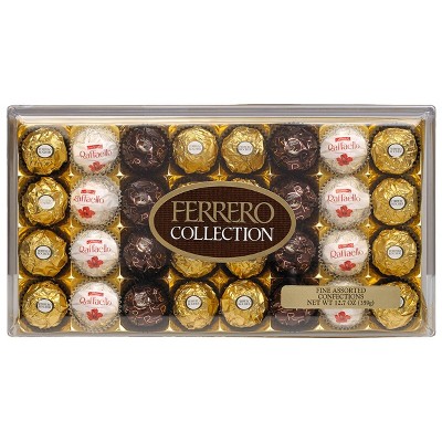 Ferrero Rondnoir: Semisweet Chocolate (Sugar, Cocoa Mass, Cocoa Butter, Soy Lecithin as Emulsifier, Vanillin: an Artificial Flavor), Sugar, Vegetable Oils (Palm and Sunflower), Wheat Flour, Cocoa Powder, Whey Powder, Skim Milk Powder, Milk Chocolate (Sugar, Cocoa Butter, Milk Powder, Cocoa Mass, Soy Lecithin as Emulsifier, Vanillin: an Artificial Flavor), Wheat Starch, Cocoa Butter, Soy Lecithin as Emulsifier, Gum Arabic as Glazing Agent, Whey Proteins, Cocoa Mass, Sodium Bicarbonate and Ammonium Bicarbonate as Leavening Agents, Salt, Vanillin: an Artificial Flavor. Ferrero Rocher: Milk Chocolate (Sugar, Cocoa Butter, Cocoa Mass, Skim Milk Powder, Butteroil, Soy Lecithin as Emulsifier, Vanillin: an Artificial Flavor), Hazelnuts, Sugar, Palm Oil, Wheat Flour, Whey, Lowfat Cocoa Powder, Soy Lecithin as Emulsifier, Sodium Bicarbonate as Leavening Agent, Salt, Vanillin: an Artificial Flavor. Raffaello: Dry Coconut, Vegetable Oils (Palm and Sheanut), Sugar, Almonds, Skim Milk Powder, Whey Powder, Wheat Flour, Tapioca Starch, Soy Lecithin as Emulsifier, Natural and Artificial Flavors, Sodium Bicarbonate as Leavening Agent, Salt.