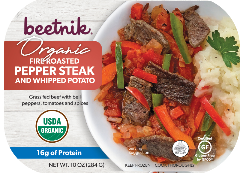 FIRE ROASTED PEPPER STEAK AND WHIPPED POTATO GRASS FED BEEF WITH BELL PEPPER, TOMATOES AND SPICES, FIRE ROASTED PEPPER STEAK AND WHIPPED POTATO