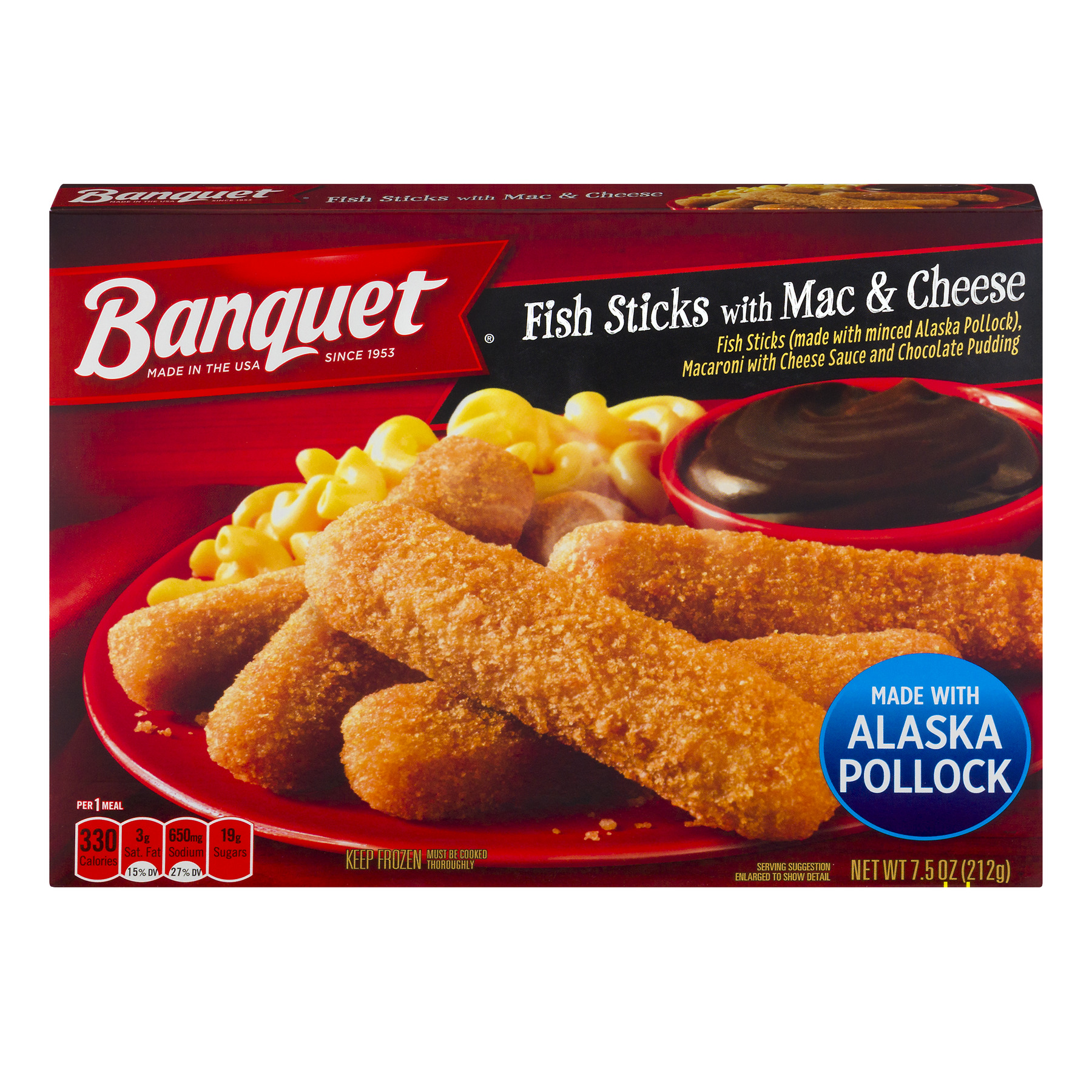 FISH STICK: Minced Pollock, Enriched Bleached And Unbleached Flour (Wheat, Niacin, Ferrous Sulfate And/Or Reduced Iron, Thiamine Mononitrate, Riboflavin, Folic Acid), Water, Contains 2% Or Less Of: Modified Corn Starch, Yellow Corn Flour, Iodized Salt, Sugar, Whey, Yeast, Rice Flour, Corn Starch, Salt, Leavening (Sodium Acid Pyrophosphate, Sodium Aluminum Phosphate, Sodium Bicarbonate), Sodium Caseinate, Caramel Color, Extractives Of Paprika (Color), Modified Cellulose, Oat Fiber, Mono And Diglycerides. Parfried in Soybean and/or Canola Oil. MACARONI AND CHEESE SAUCE: CHEESE SAUCE: Water, Cheddar Club Cheese (Pasteurized Cultured Milk, Salt, Enzymes, Annatto [Color]), Modified Whey, Soybean Oil, Modified Corn Starch, Nonfat Dry Milk, Cheese Flavor (Whey, Cheese [Granular and Blue {Pasteurized Milk, Cheese Culture, Salt, Enzyme}], Sunflower Oil, Maltodextrin, Salt, Sodium Phosphate, Citric Acid, Lactic Acid), Salt, Sugar, Sodium Phosphates, Xanthan Gum, Citric Acid, Guar Gum, Beta Carotene (Color). MACARONI: COOKED PASTA: Water, Enriched Pasta (Durum Wheat Semolina, Niacin, Ferrous Sulfate, Thiamin Mononitrate, Riboflavin, Folic Acid. CHOCOLATE PUDDING: Water, Pudding Blend (Sugar, Diary Product Solids [Modified Whey, Reduced Protein Whey, Whey Solids], Modified Corn Starch, Sweet Cream Powder [Sweet Cream, Nonfat Milk, Sodium Caseinate, Tocopherol], Cocoa Powder, Maltodextrin, Propylene Glycol Esters of Fatty Acids and Mono and Diglycerides, Soy Lecithin, Salt), Soybean Oil, Cellulose Gel, Cellulose Gum. CONTAINS: FISH (ALASKA POLLOCK), MILK, SOY, WHEAT.