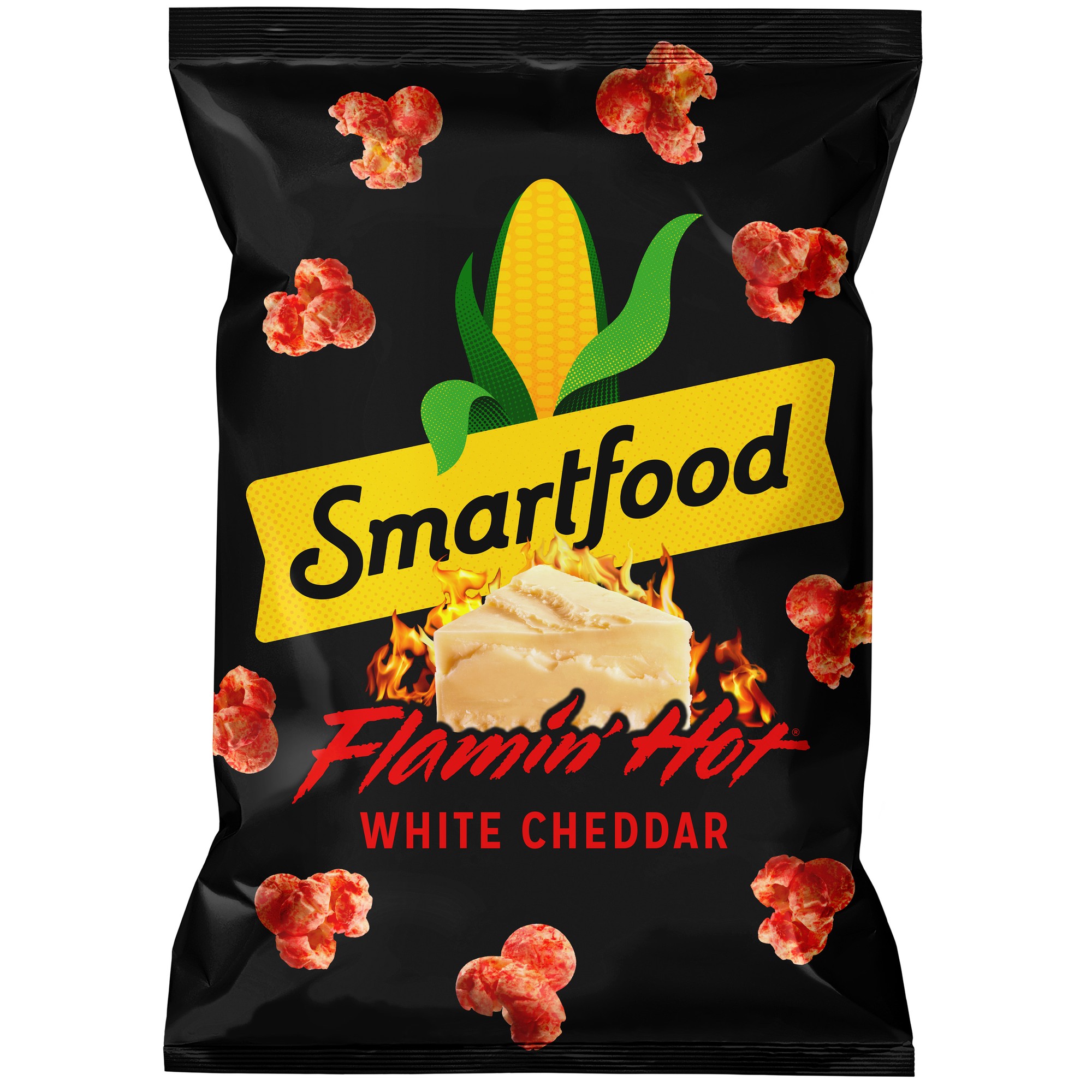 FLAMIN' HOT WHITE CHEDDAR FLAVORED POPCORN, FLAMIN' HOT WHITE CHEDDAR