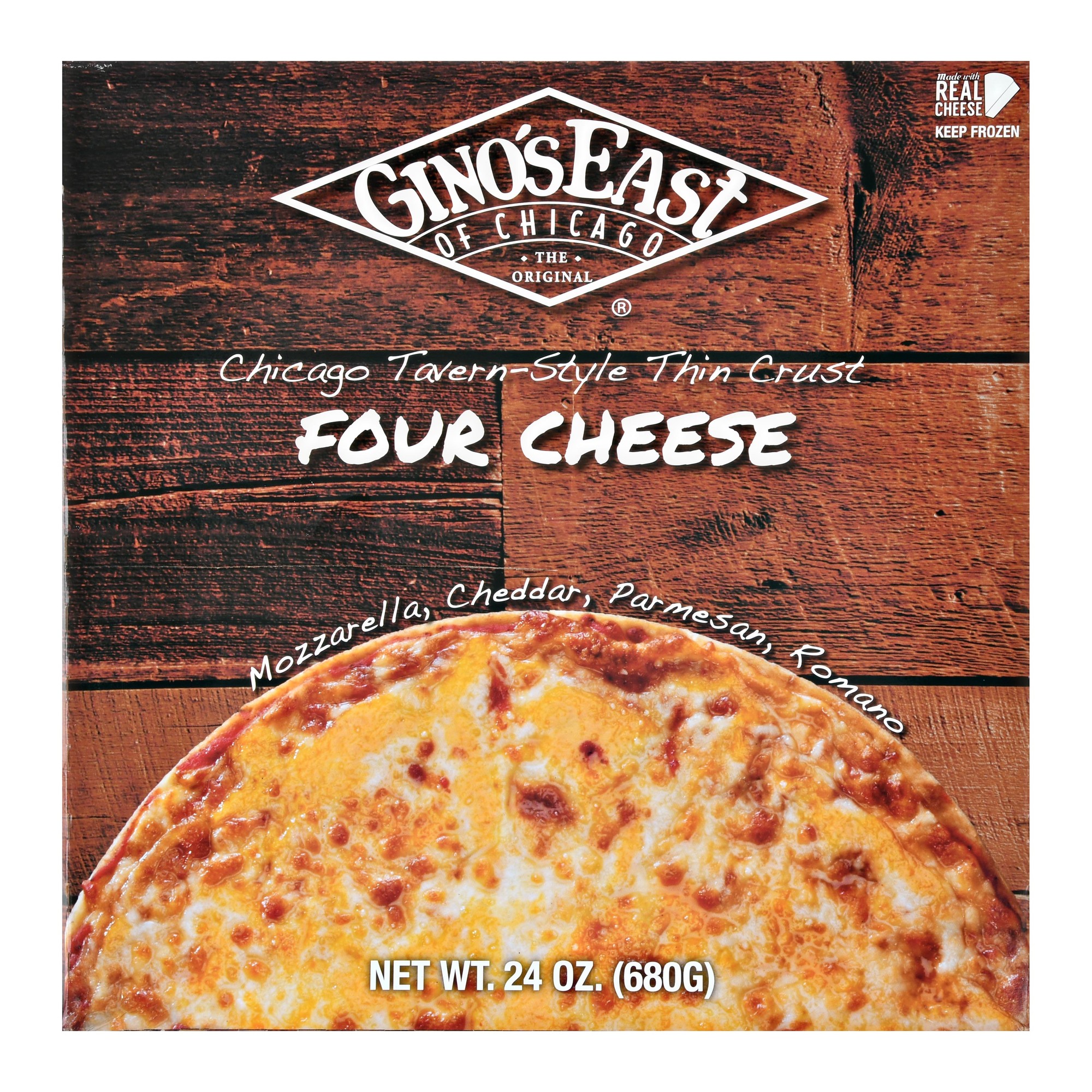 FOUR CHEESE MOZZARELLA, CHEDDAR, PARMESAN, ROMANO CHICAGO TAVERN-STYLE THIN CRUST PIZZA, FOUR CHEESE