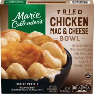 Pasta and Cheese Sauce (Cooked Enriched Pasta [Water, Enriched Pasta {Durum Wheat Semolina, Niacin, Reduced Iron (Ferrous Sulfate), Thiamine Mononitrate, Riboflavin, Folic Acid}], Water, Cheddar Club Cheese [Pasteurized Cultured Milk, Salt, Enzymes, Annatto], Maltodextrin, Soybean Oil, Contains 2% of Less of: Butter [Cream, Salt], Enzyme Modified Cheese [Cheddar and Colby Cheese {Pasteurized Milk, Cheese Cultures, Salt, Enzymes}, Water, Lactic Acid, Yeast Extract, Sodium Citrate, Sodium Phosphate, Salt, Enzymes], Whey, Nonfat Dry Milk, Modified Corn Starch, Salt, Disodium Phosphate, Xanthan Gum, Guar Gum, Citric Acid), Breaded White Meat Chicken Patty Strips (Chicken Breast with Rib Meat, Breader [Corn Flour, Wheat Flour, Salt, Monosodium Glutamate, Dextrose, Flavorings, Ground Celery Seed], Batter [Water, Wheat Flour, Modified Corn Starch, Salt], Water, Salt, Sodium Phosphates, Autolyzed Yeast Extract, Flavorings, Fried in Vegetable Oil).