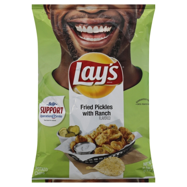POTATOES, VEGETABLE OIL (CORN, CANOLA, AND/OR SUNFLOWER OIL), FRIED PICKLES WITH RANCH SEASONING (BUTTERMILK, SALT, MALTODEXTRIN [MADE FROM CORN], GARLIC POWDER, SPICES, YOGURT POWDER [CULTURED SKIM MILK], NATURAL FLAVORS, CANOLA OIL, SUGAR, MEDIUM CHAIN TRIGLYCERIDES, ONION POWDER, YEAST EXTRACT, TOMATO POWDER, DEXTROSE, PAPRIKA, ACACIA GUM, SOUR CREAM [CREAM, SKIM MILK, CULTURES], CARAMEL COLOR, AND PAPRIKA EXTRACTS).