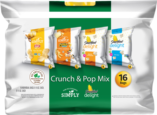 Simply Cheetos Puffs White Cheddar Cheese Flavored Snacks: (Organic Corn Meal, Expeller-pressed Sunflower Oil, Cheddar Cheese (Milk, Cheese Cultures, Salt, Enzymes), Whey, Maltodextrin (Corn), Sea Salt, Natural Flavors, Sour Cream (Cultured Cream, Skim Milk), Torula Yeast, Lactic Acid, And Citric Acid), Smartfood Delight White Cheddar Cheese Popcorn: (Popcorn, Vegetable Oil (Sunflower, Corn, Canola Oil), Maltodextrin (Corn), Reduced Lactose Whey, Cheddar Cheese (Milk, Cheese Cultures, Salt, Enzymes), Salt, Whey Protein Concentrate, Whey, Natural Flavors, Buttermilk, Potassium Chloride, Lactic Acid, And Citric Acid), Smartfood Delight Sea Salt Popcorn: (Popcorn, Expeller-pressed Sunflower Oil, And Sea Salt), Lay's Simply Sea Salt Potato Chips: (Potatoes, Expeller-pressed Sunflower Oil, And Sea Salt)