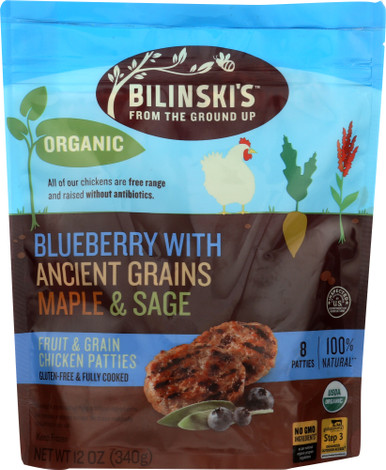 FRUIT & GRAIN CHICKEN PATTIES, BLUEBERRY WITH ANCIENT GRAINS MAPLE & SAGE