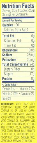 WHITE GRAPE JUICE CONCENTRATE, SUGAR, CORN SYRUP, CONTAINS 2% OR LESS OF: CARRAGEENAN, NATURAL FLAVORS, ASCORBIC ACID (VITAMIN C), DEXTROSE, HYDROGENATED COCONUT OIL, RASPBERRY AND APPLE JUICE CONCENTRATES, RED CABBAGE EXTRACT COLOR, PAPRIKA EXTRACT COLOR, PEACH JUICE, ANNATTO EXTRACT COLOR, ELDERBERRY JUICE CONCENTRATE COLOR, CARNUBA WAX, CORNSTARCH, BEESWAX, CITRIC ACID.