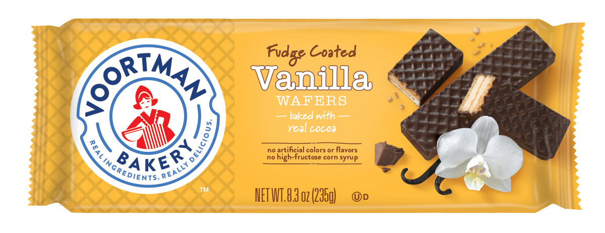 FUDGE COATED VANILLA WAFERS BAKED WITH REAL COCOA, VANILLA