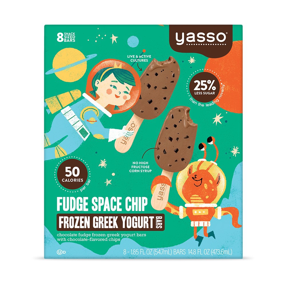 FUDGE SPACE CHIP CHOCOLATE FUDGE FROZEN GREEK YOGURT BARS WITH CHOCOLATE-FLAVORED CHIPS, FUDGE SPACE CHIP