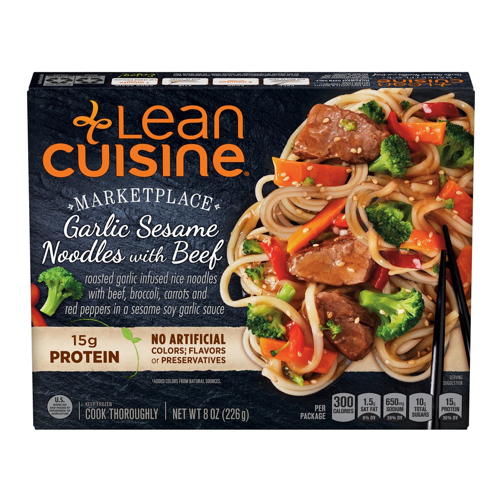 GARLIC SESAME NOODLES WITH BEEF ASIAN-STYLE NOODLES WITH BEEF, BROCCOLI, CARROTS & RED PEPPERS IN A GARLIC SESAME SAUCE, GARLIC SESAME NOODLES WITH BEEF