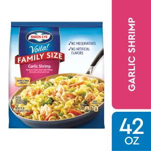 Vegetables (Broccoli, Carrots, Corn), Pasta With Garlic Sauce (Cooked Enriched Pasta [Water, Enriched Wheat Flour {Durum Wheat Semolina, Niacin, Reduced Iron, Thiamine Mononitrate, Riboflavin, Folic Acid}], Soybean Oil, Modified Whey, Salt, Garlic Seasoning [Garlic Powder, Sugar, Spices, Yeast Extract, Salt, Whey, Enzyme Modified Milkfat, Natural Flavors {With Milk}], Enriched Wheat Flour [Wheat Flour, Niacin, Reduced Iron, Thiamin Mononitrate, Riboflavin, Folic Acid], Cream Flavor [Maltodextrin, Lipolyzed Cream], Natural Garlic Oil Blend [Medium Chain Triglycerides, Natural Flavors, Soy Lecithin]), Cooked Shrimp (Shrimp, Water, Salt, Sodium Tripolyphosphate).