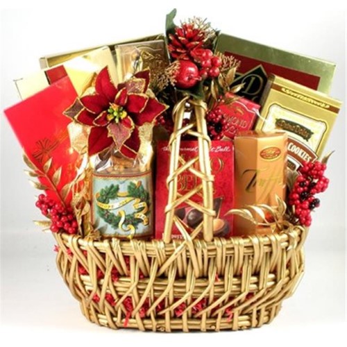 Create Special Christmas Memories With This Wonderful Gift That Offers A Gorgeous Golden Basket Filled With Buttercrunch Toffee With Chocolate And Almonds, Mint Chocolate Malt Balls, Chocolate Dipped Truffle Cookies, Chocolate Cream Filled Wafer Roll Cookies, Cinnamon Glazed Georgia Pecans, Dark Chocolate Truffles, Pecan Caramel Popcorn Drizzled With Semi-sweet Chocolate, Almond Caramel Popcorn Drizzled With Semi-sweet Chocolate, Noel Gourmet Snack Mix, Fireside Raspberry Premium Gourmet Cocoa With The Message Wishing You All The Wonder And A Happy Holidays Tea Folder Filled With A Selection Of Popular Teas! Topped With An Elegant Holiday Bow And Adorned With Beautiful Red And Gold Accents This Is A Spectacular Gift Basket That They Will Adore