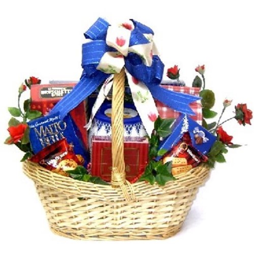 Ur Sweet Expressions Gift Basket Is Trimmed With Elegant Silk Roses And Ivy And Filled With Gourmet Milk Chocolate Covered Cherry Cordials, Chocolate Chip Shortbread Cookies, Butter Shortbread Cookies, Premium Chocolate Toffee Truffles, A Lovely Tin Filled With Butter Cookies, Yogurt Covered Pretzels, Key Lime White Chocolate Cookies, Jamaican Me Crazy Flavored Coffee, Caramel Kiss Flavored Coffee And A Box Of Assorted Chocolate Dipped Cookies