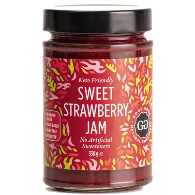 Strawberries, Water, Erythritol, Pectin, Rowan berry extract, Lemon powder, Citric acid, Carrot and blackcurrant concentrate, Stevia extract, Ascorbic acid.
