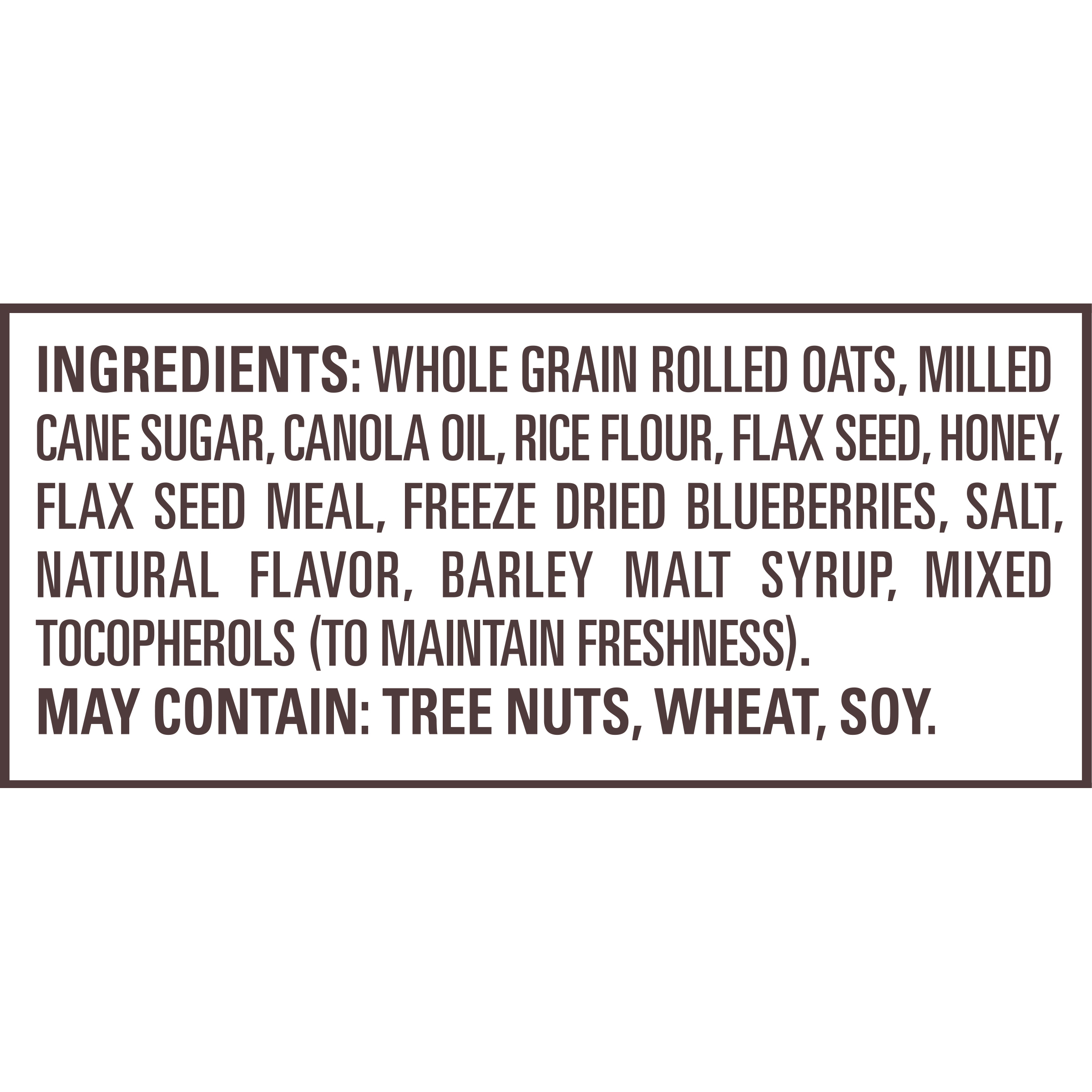 WHOLE GRAIN ROLLED OATS, MILLED CANE SUGAR, CANOLA OIL, RICE FLOUR, FLAX SEED, HONEY, FLAX SEED MEAL, FREEZE DRIED BLUEBERRIES, SALT, NATURAL FLAVOR, BARLEY MALT SYRUP, MIXED TOCOPHEROLS (TO MAINTAIN FRESHNESS).