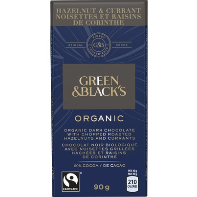 Dark chocolate (cocoa mass, raw cane sugar, cocoa butter, soy lecithin, vanilla extract), chopped roasted hazelnuts, currants. Organic certified. Contains soy and hazelnut. May contain milk and almond.