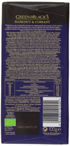 Ingredients: Cocoa mass #, raw cane sugar #, chopped roasted HAZELNUTS#, currants #, cocoa butter #, emulsifier (SOYAlecithin #), vanilla extract #.# = Certified Organic ORGANIC CHOCOLATE: MINIMUM COCOA SOLIDS 60%Cocoa, Sugar, Vanilla: traded in compliance with Fairtrade Standards, total 75%. Visit www.info.fairtrade.netFairtrade means fairer trading conditions and opportunities for producers in developing countries to invest in their businesses and communities for a sustainable future.. MAY CONTAIN OTHER NUTS, MILK.