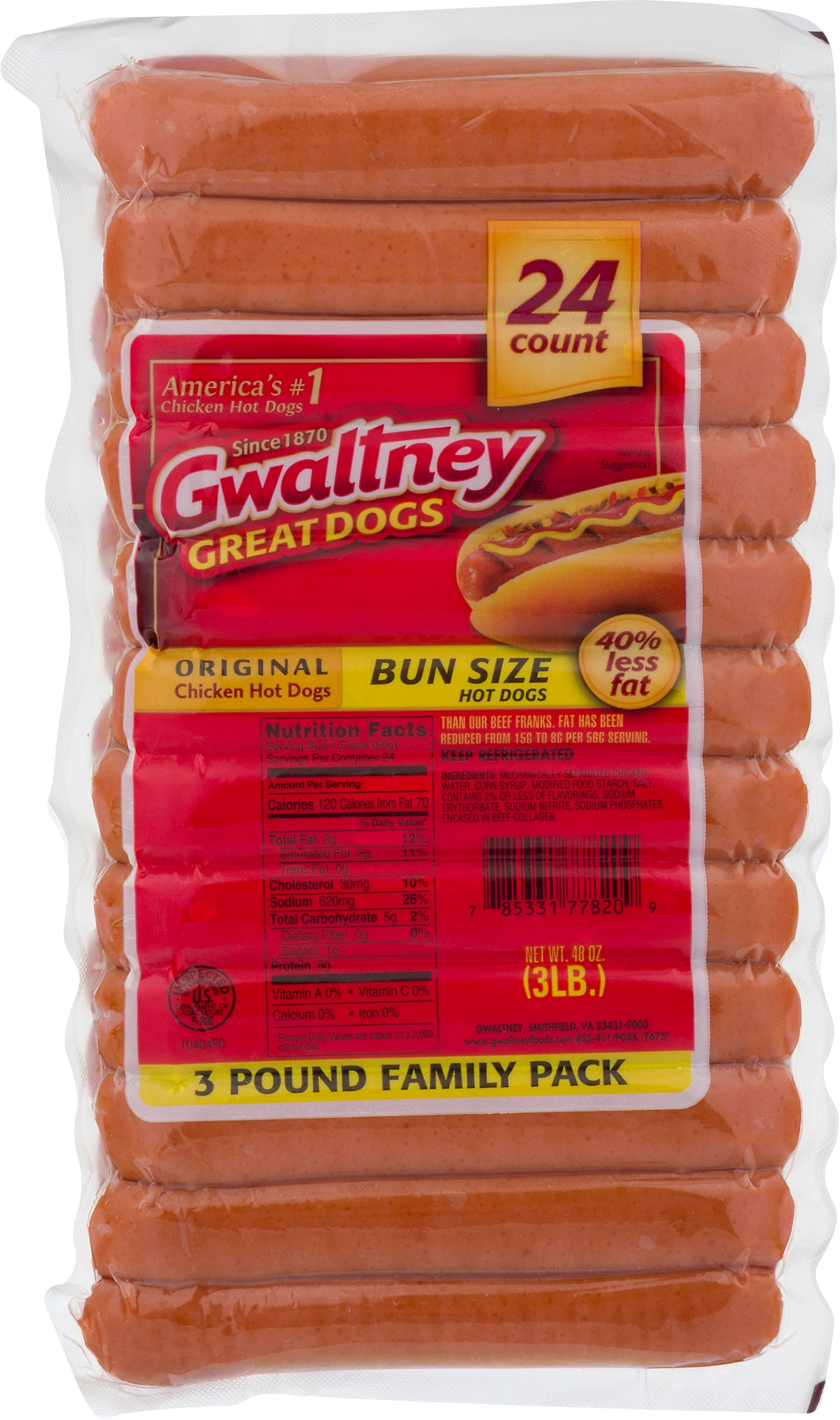 Gwaltney Hot Dogs, Chicken, Original, Bun Size, 3 Pound Family Pack