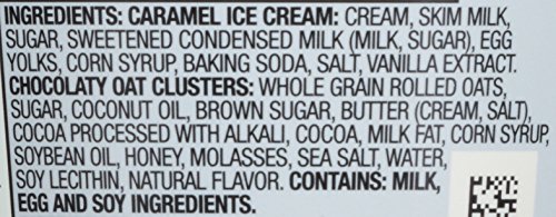 CARAMEL ICE CREAM: CREAM, SKIM MILK, SUGAR, SWEETENED CONDENSED MILK, (MILK, SUGAR), EGG YOLKS, CORN SYRUP, BAKING SODA, SALT, VANILLA EXTRACT. CHOCOLATY OAT CLUSTERS: WHOLE GRAIN ROLLED OATS, SUGAR, COCONUT OIL, BROWN SUGAR, BUTTER (CREAM, SALT), COCOA PROCESSED WITH ALKALI, COCOA, MILK FAT, CORN SYRUP, SOYBEAN OIL, HONEY, MOLASSES, SEA SALT, WATER, SOY LECITHIN, NATURAL FLAVOR.